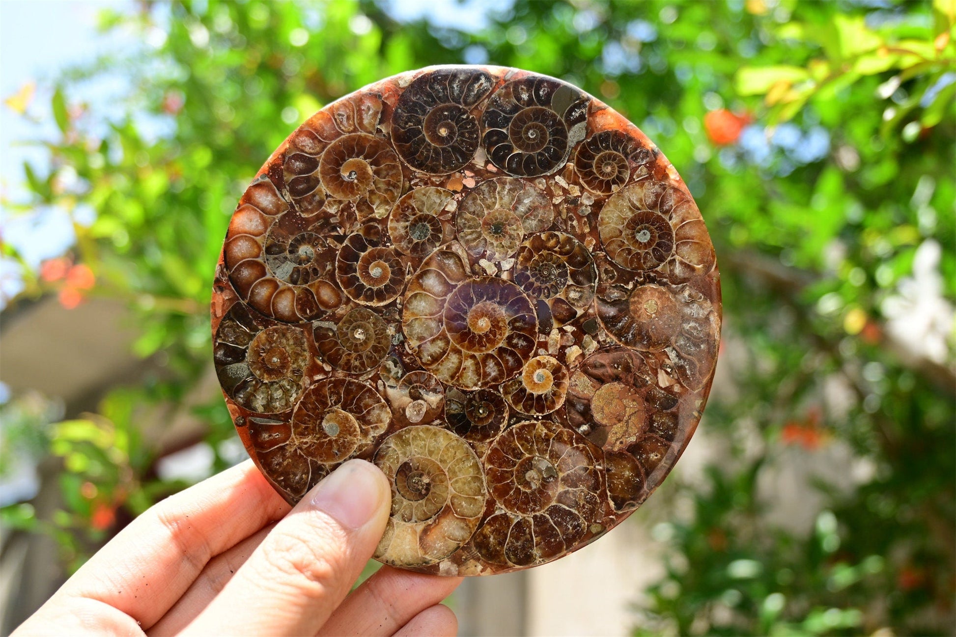 These fossils were collected from Tuléar Province, Madagascar. Each disc contains several natural Cambrian ammonite fossils of varying sizes, which have been cut open to reveal their internal structures. Finally, they were hand-polished to bring out their luster. This is one of the most exquisite fossil collections to date.