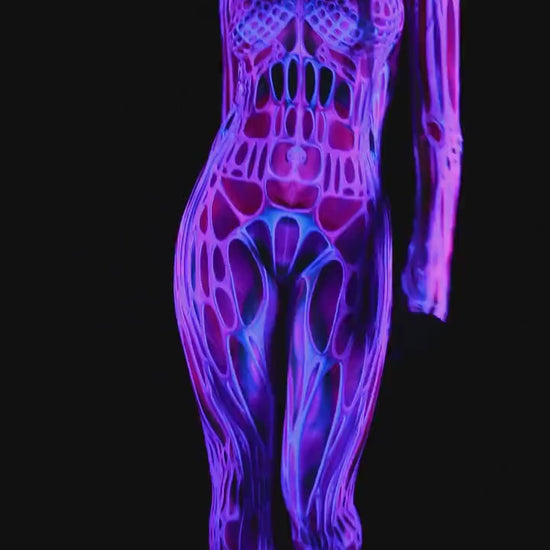 > The bodysuit glows in the dark if a strong U.V. light is near it.