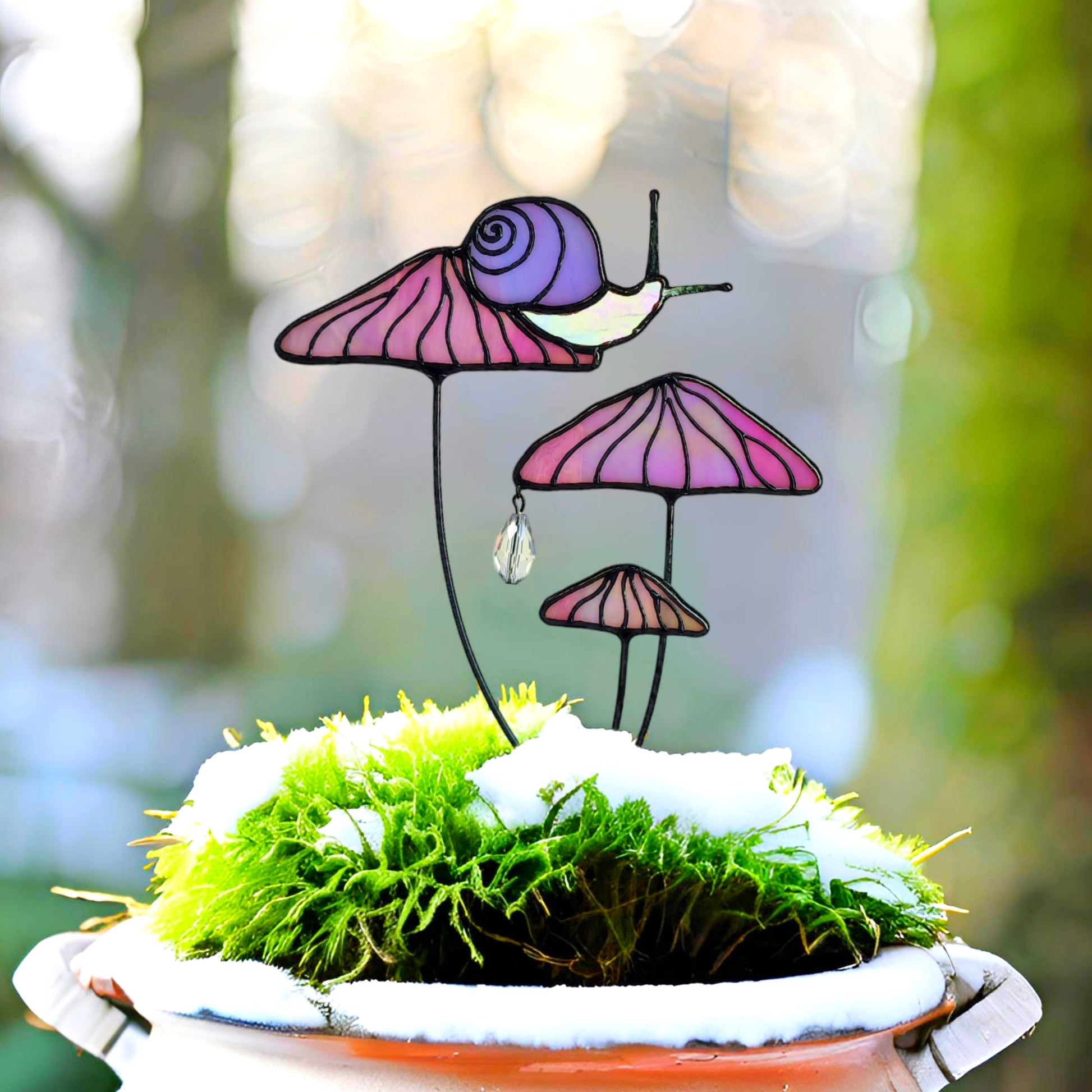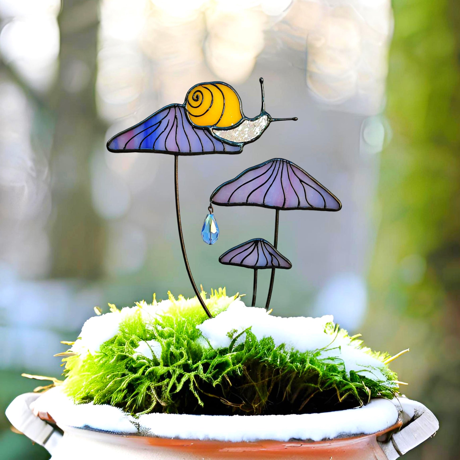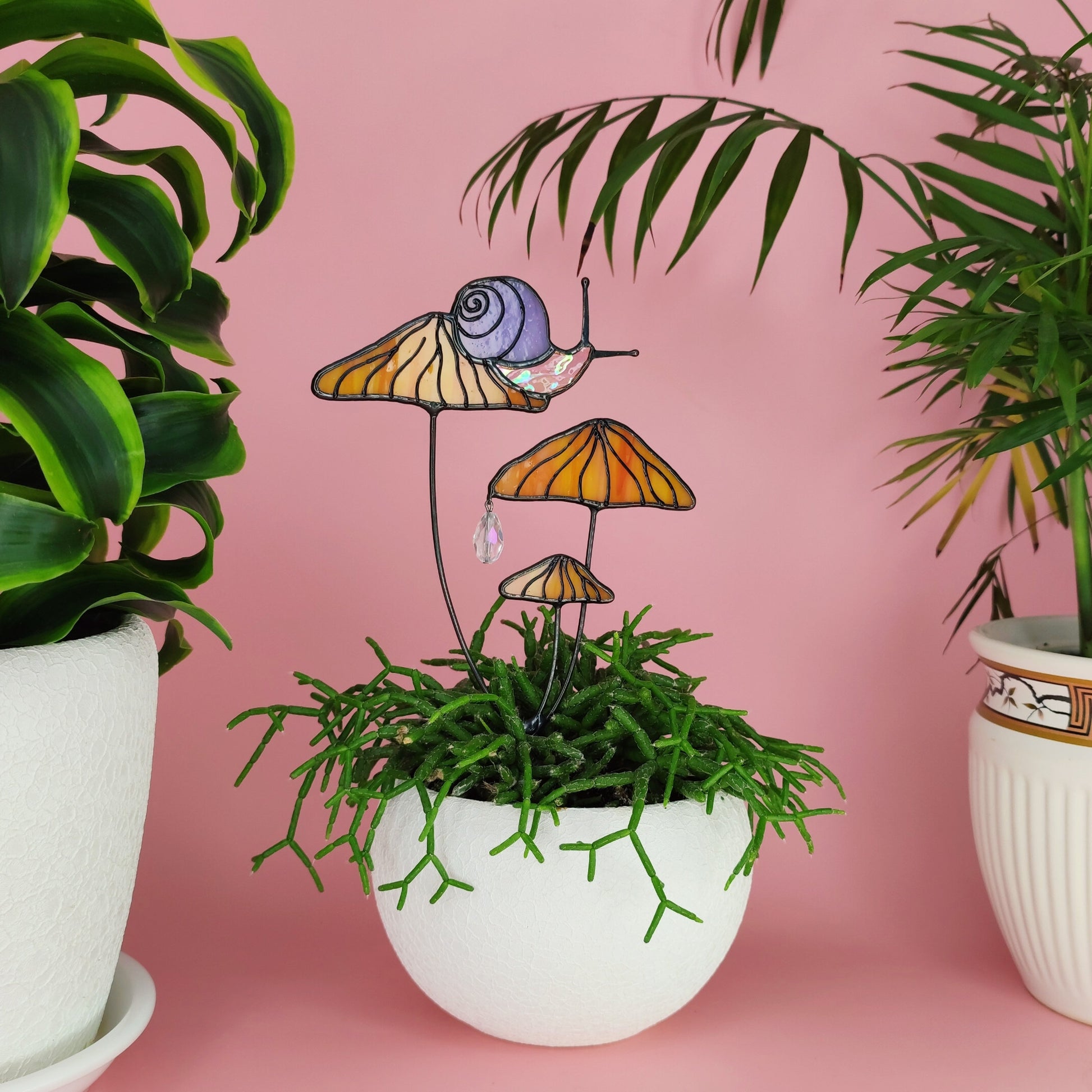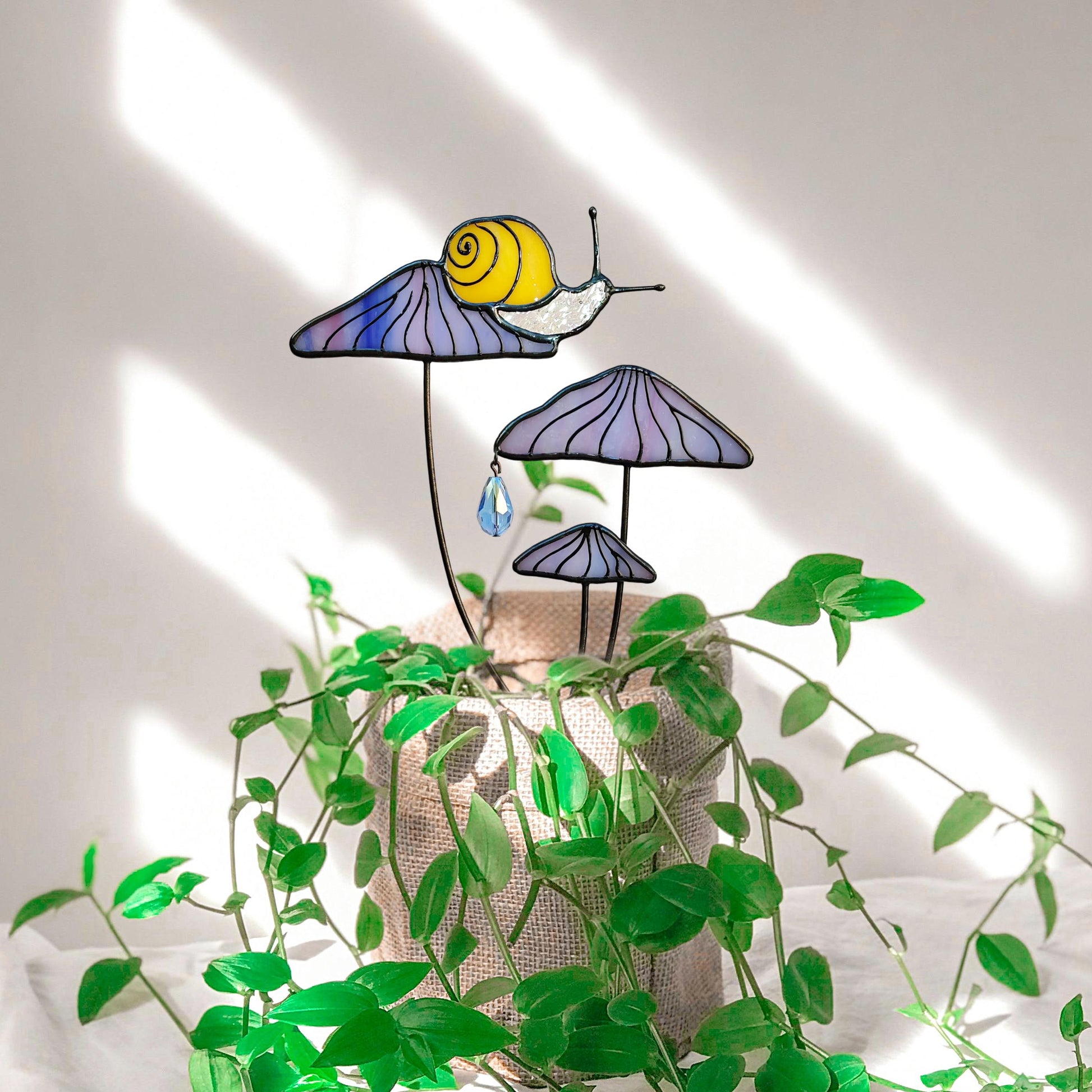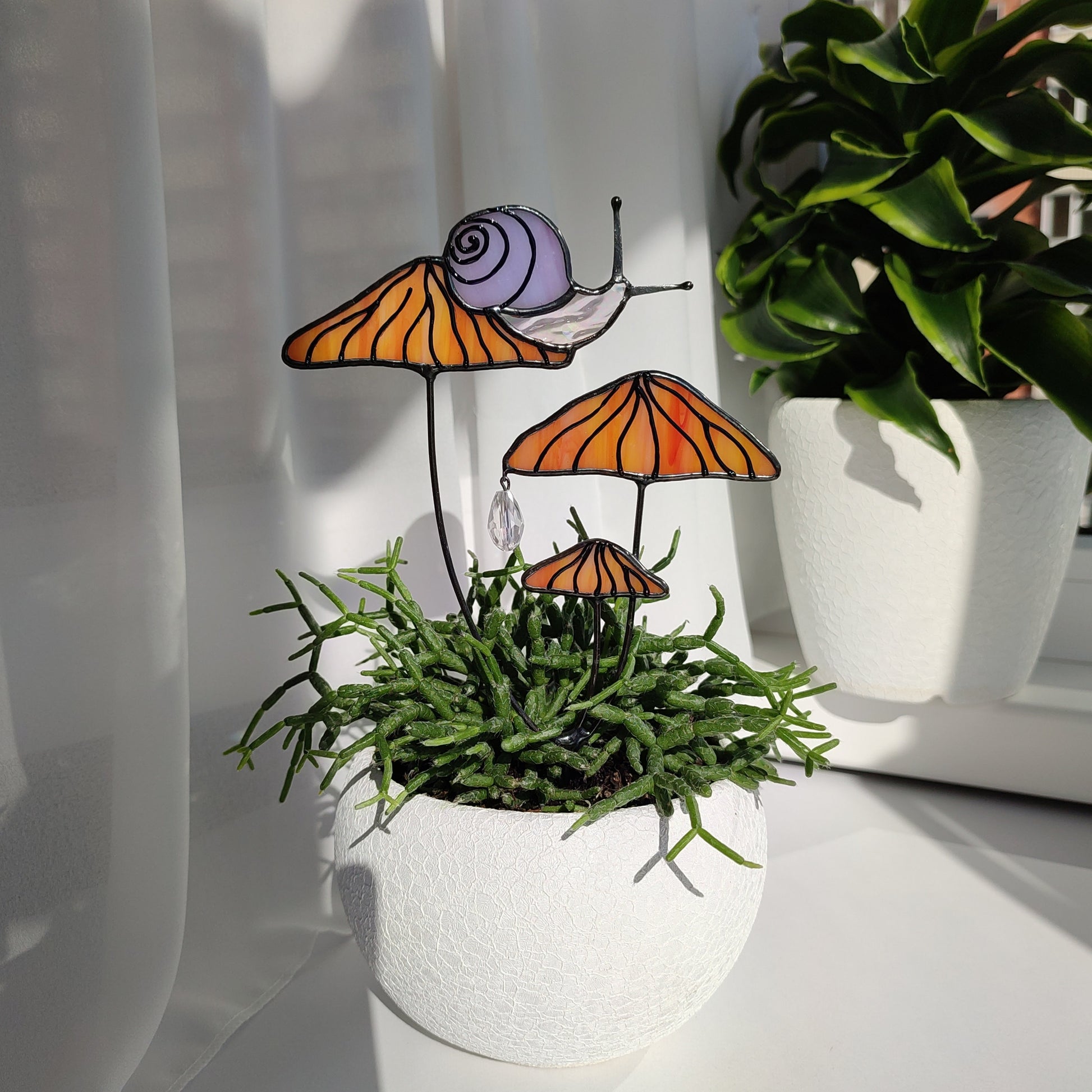 Experience enchantment in your garden with our Magical Snail on Orange Mushroom Plant Stake. This stunning stained glass garden decoration is perfect for mushroom lovers and plant enthusiasts.